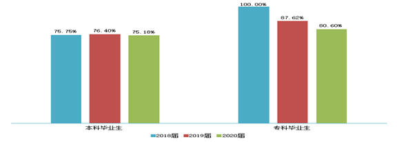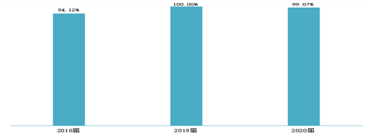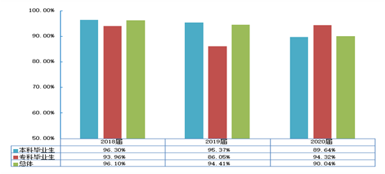 近三届毕业生就业率始终保持在90.00%以上,其中2020届本科毕业生的就业率为89.64%,专科毕业生的就业率为94.32%。