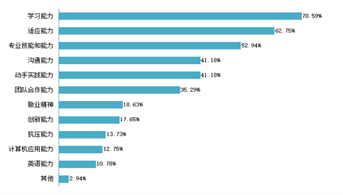 对专业素质的评价:对于目前工作需求而言,2020届本科毕业生认为专业知识和专业能力的重要度均在93.00%以上,对工作/学习的满足程度均在84.00%以上。2020届专科毕业生认为专业知识和专业能力的重要度均在98.00%以上,对工作/学习的满足程度均在91.00%以上。